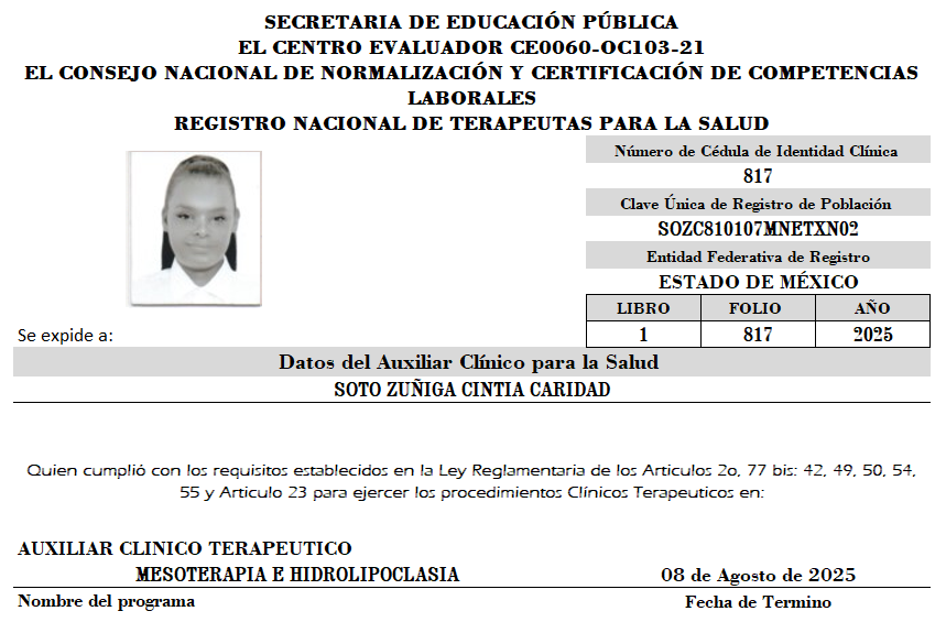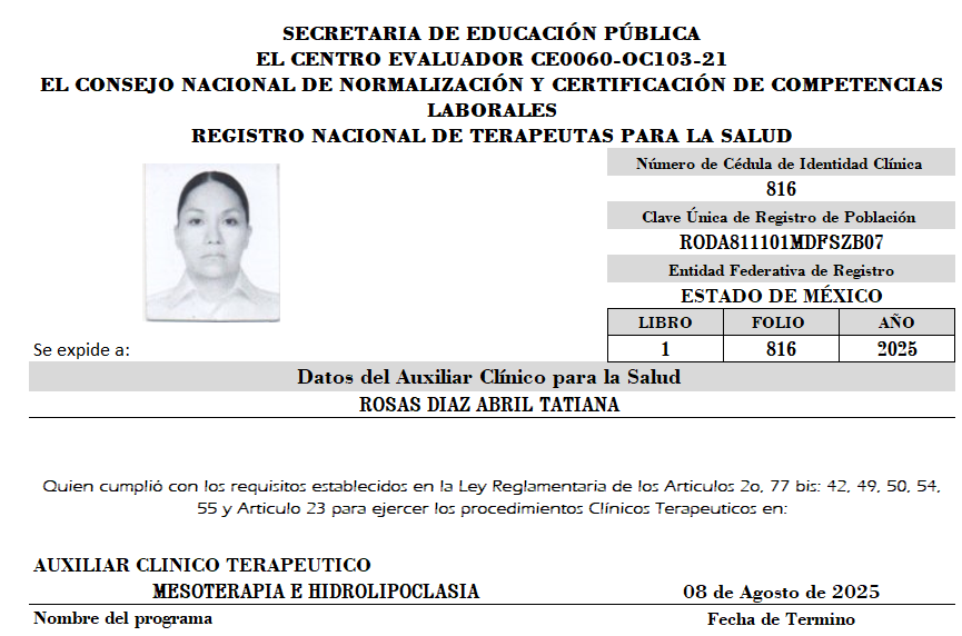 | HERNANDEZ AGUIRRE JAQUELYNE VIRIDIANA | MESOTERAPIA E HIDROLIPOCLASIA | 00844 | 19-09-25 |
