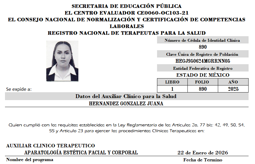 | HERNANDEZ ROSADO MARIA FERNANDA | APARATOLOGÍA ESTÉTICA FACIAL Y CORPORAL | 00859 | 18-10-25 |