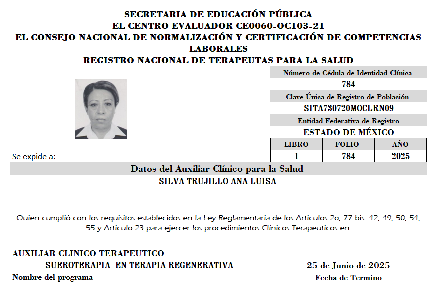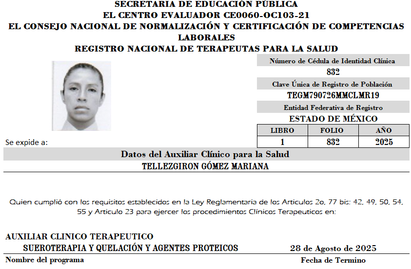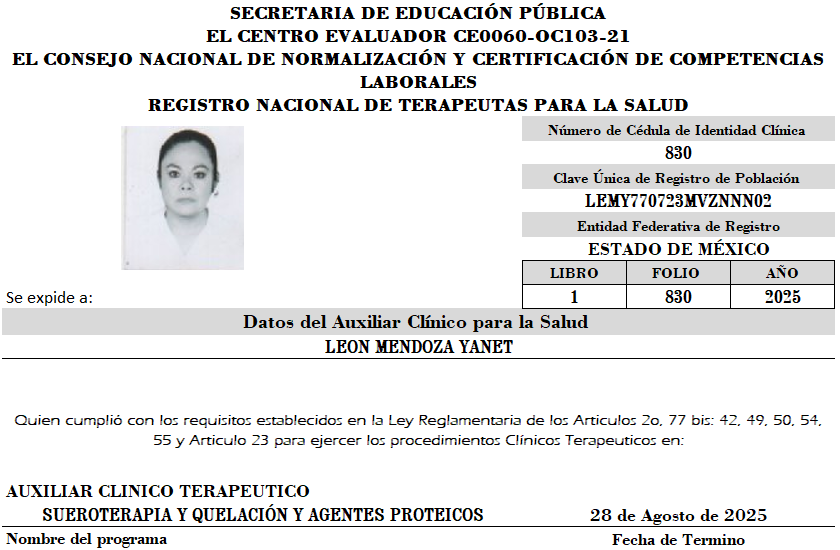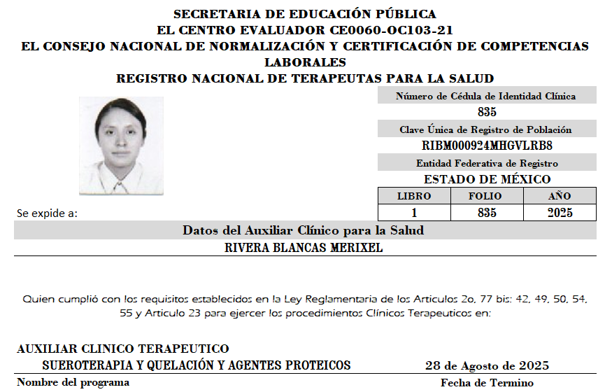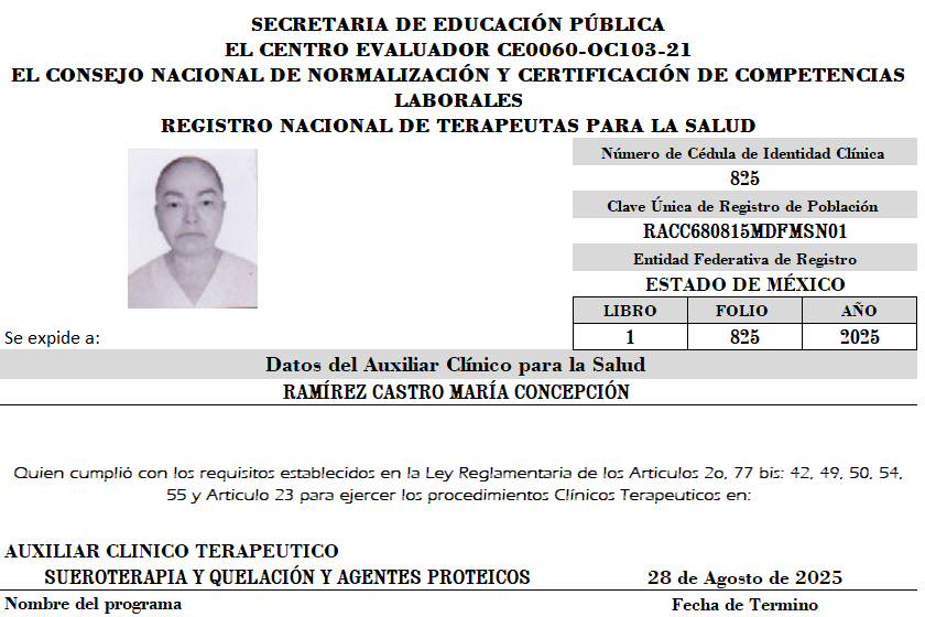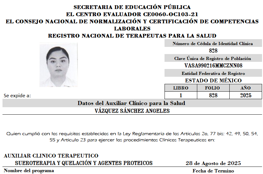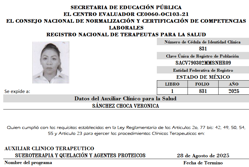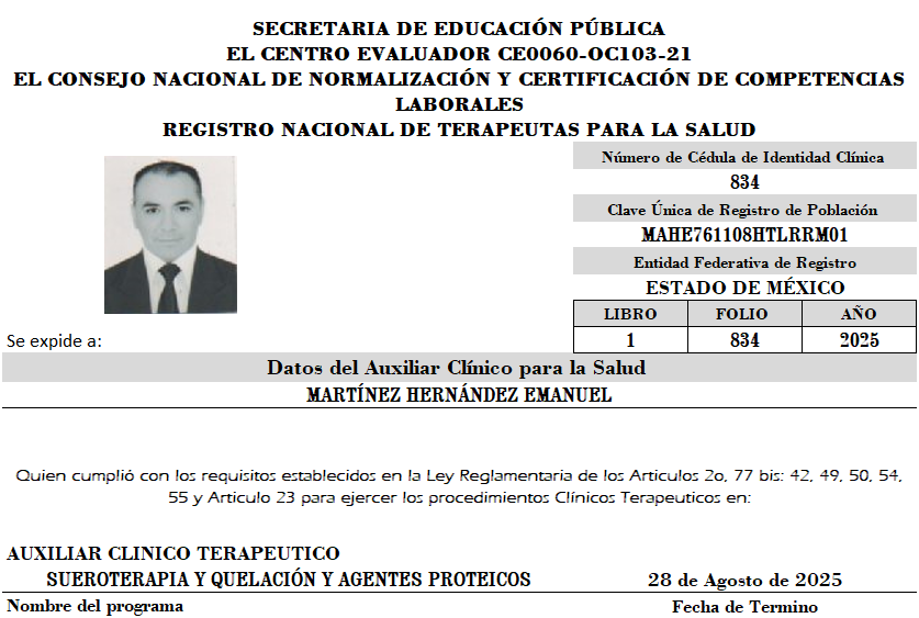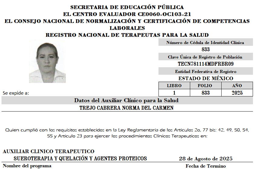 TREJO CABRERA NORMA DEL CARMEN SUEROTERAPIA Y QUELACIÓN Y AGENTES PROTEICOS 00833 28-08-25