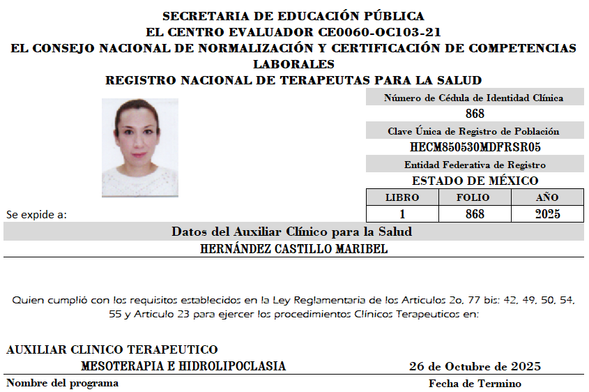HERNÁNDEZ CASTILLO MARIBEL MESOTERAPIA E HIDROLIPOCLASIA 00868 26-10-25