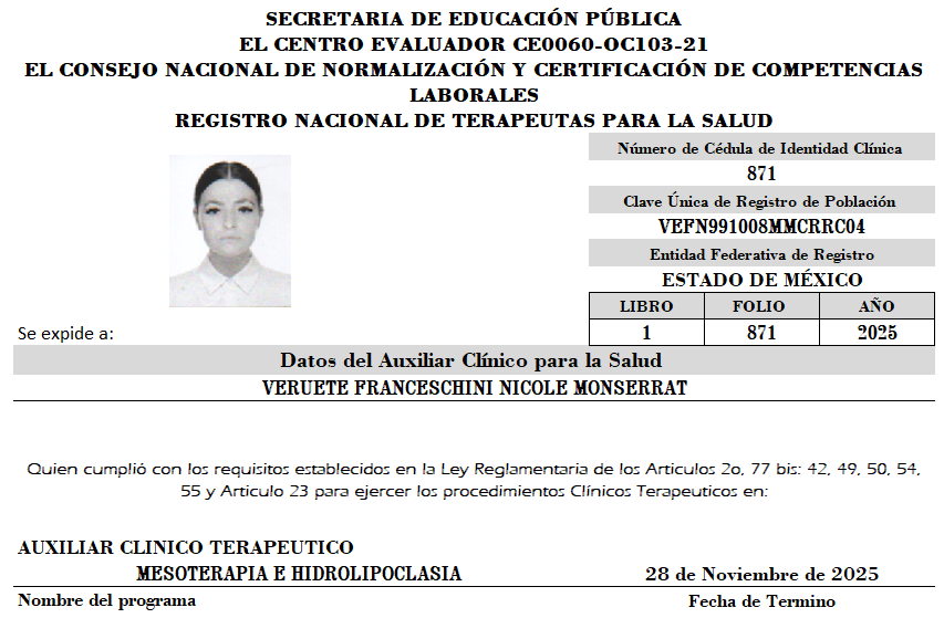 VERUETE FRANCESCHINI NICOLE MONSERRAT MESOTERAPIA E HIDROLIPOCLASIA 00871 28-11-25