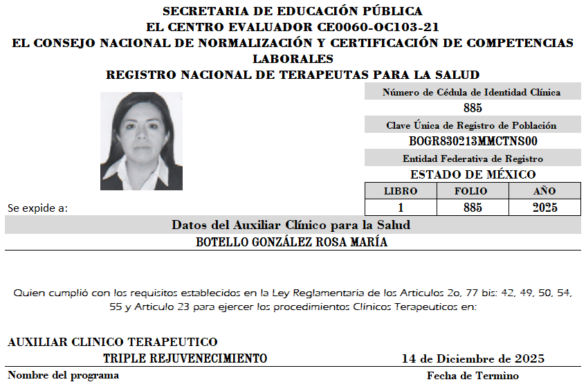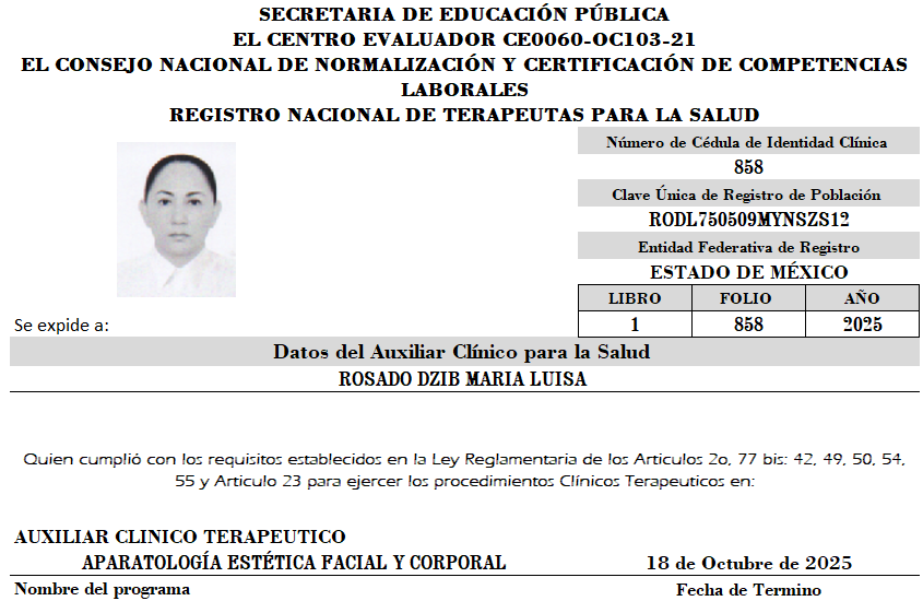 ROSADO DZIB MARIA LUISA APARATOLOGÍA ESTÉTICA FACIAL Y CORPORAL 00858 18-10-25