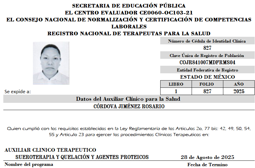 CÓRDOVA JIMÉNEZ ROSARIO SUEROTERAPIA Y QUELACIÓN Y AGENTES PROTEICOS 00827 28-08-25