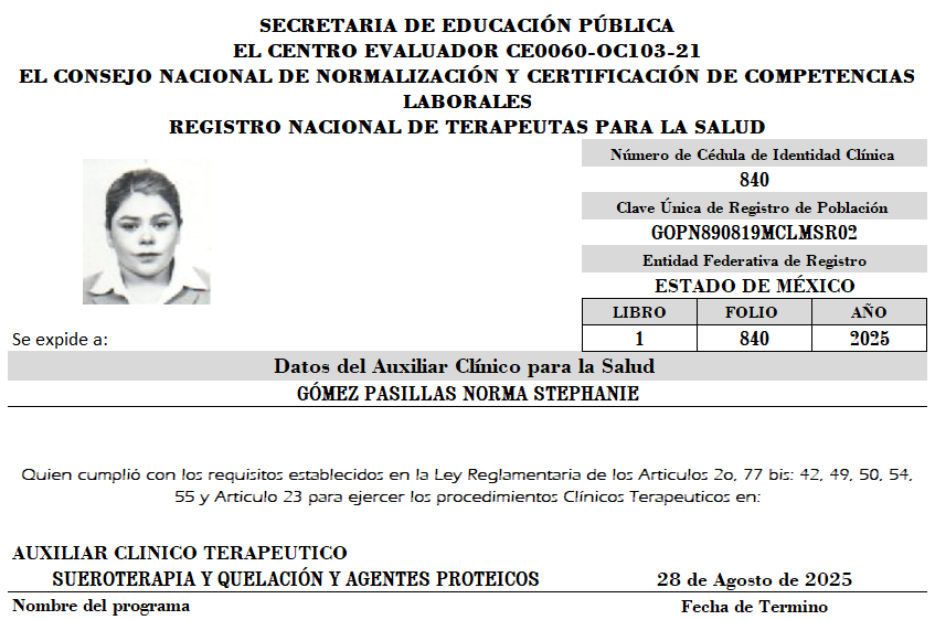 GÓMEZ PASILLAS NORMA STEPHANIE SUEROTERAPIA Y QUELACIÓN Y AGENTES PROTEICOS 00840 28-08-25