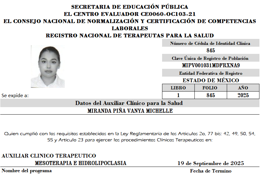 MIRANDA PIÑA VANYA MICHELLE MESOTERAPIA E HIDROLIPOCLASIA 00845 19-09-25