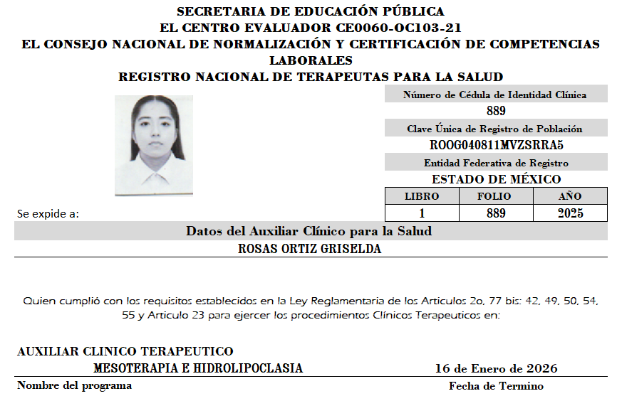 ROSAS ORTIZ GRISELDA MESOTERAPIA E HIDROLIPOCLASIA 00889 15-01-26