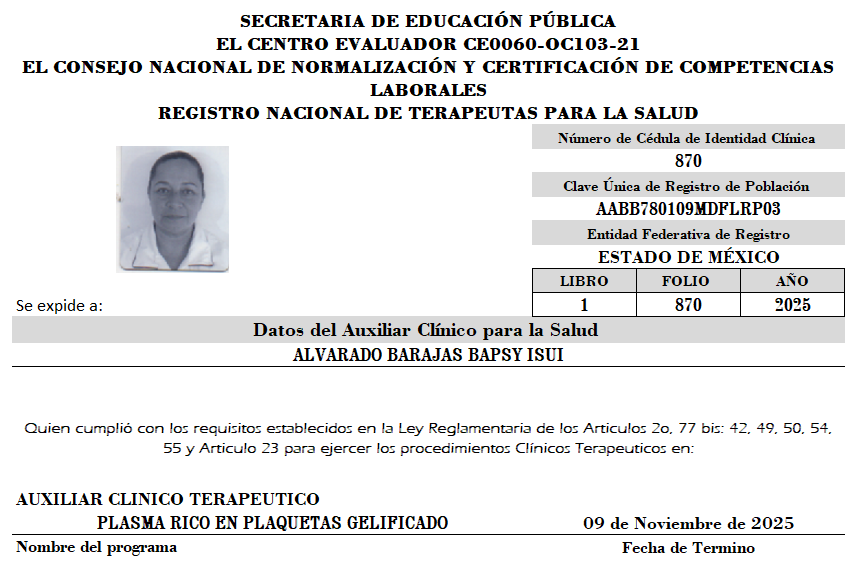 ALVARADO BARAJAS BAPSY ISUI PLASMA RICO EN PLAQUETAS GELIFICADO 00870 09-11-25