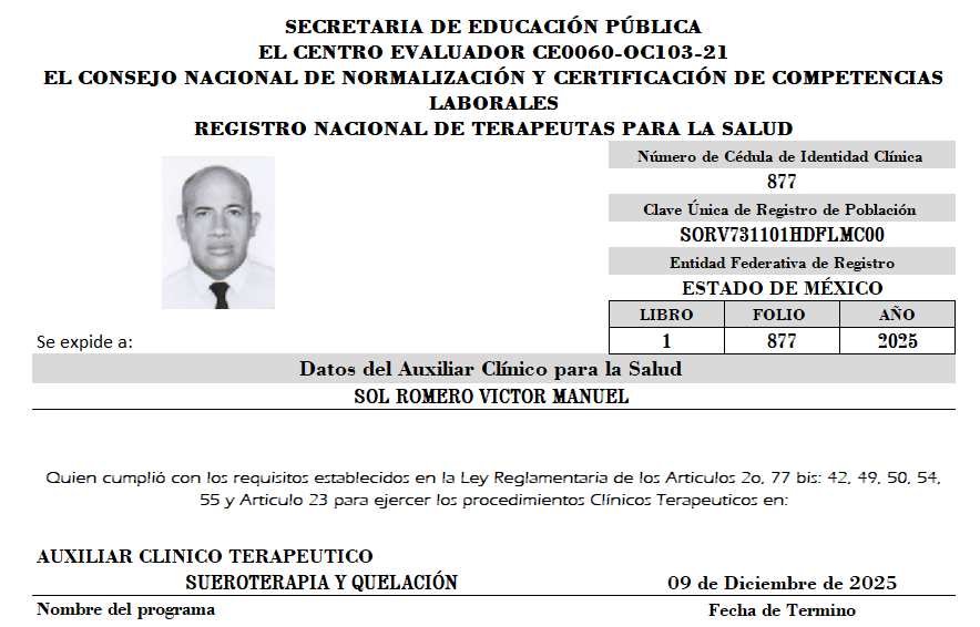 SOL ROMERO VICTOR MANUEL SUEROTERAPIA Y QUELACIÓN 00877 07-12-25