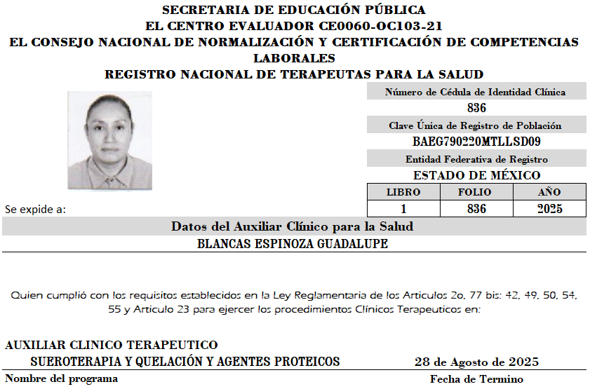 BLANCAS ESPINOZA GUADALUPE SUEROTERAPIA Y QUELACIÓN Y AGENTES PROTEICOS 00836 28-08-25