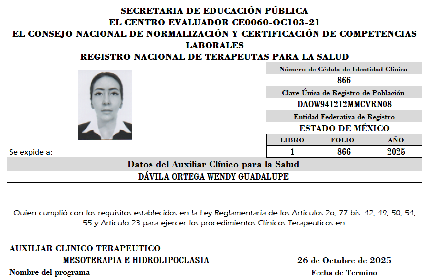 DÁVILA ORTEGA WENDY GUADALUPE MESOTERAPIA E HIDROLIPOCLASIA 00866 26-10-25