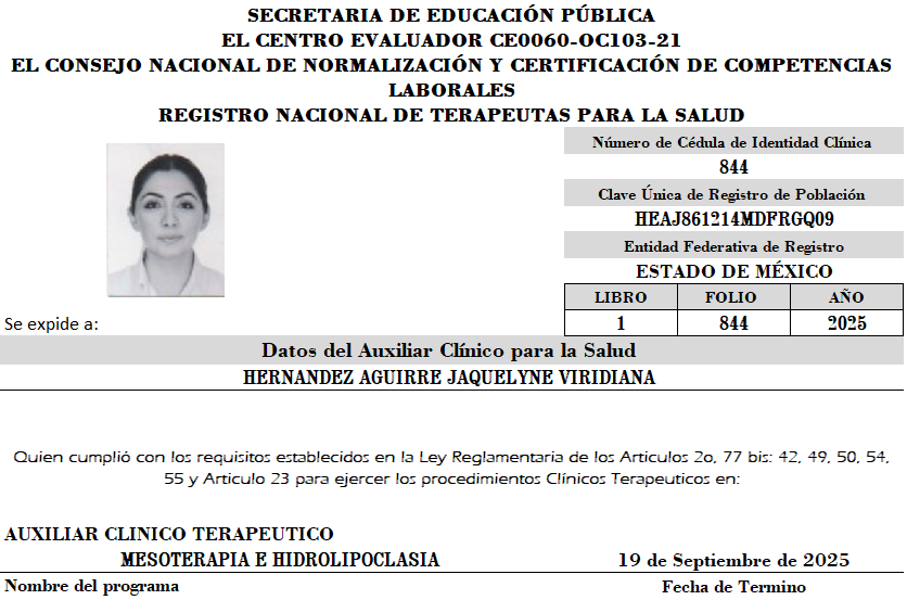 HERNANDEZ AGUIRRE JAQUELYNE VIRIDIANA MESOTERAPIA E HIDROLIPOCLASIA 00844 19-09-25