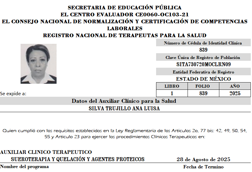 SILVA TRUJILLO ANA LUISA SUEROTERAPIA Y QUELACIÓN Y AGENTES PROTEICOS 00839 28-08-25